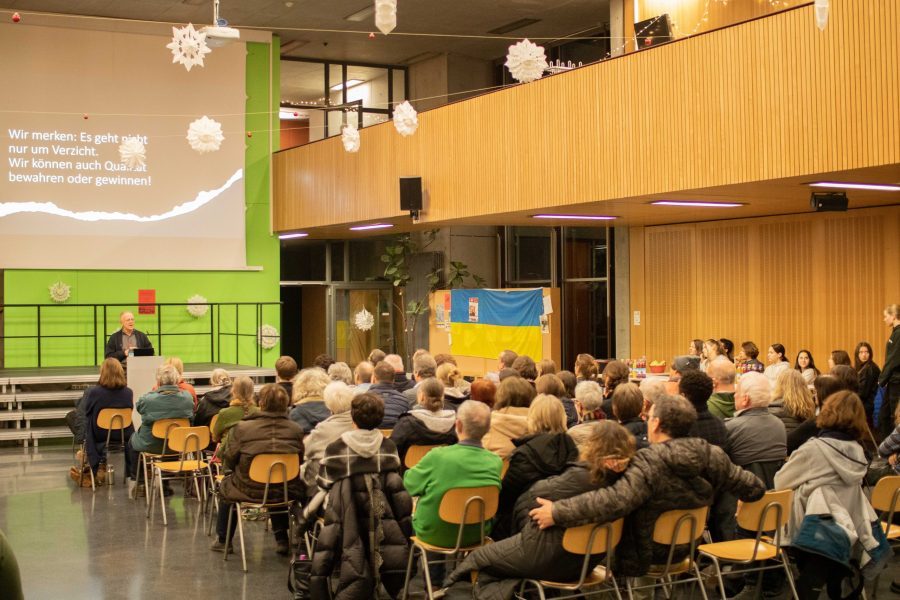 Pater Alt, der sich wegen Containerns selbst angezeigt und immer wieder Aktionen der „Letzten Generation“ unterstützt hat, zeigte am Gymnasium Eckental am 30. November 2022 vor über hundert Gästen unterschiedlichen Alters die Notwendigkeit auf, die Gesellschaft gerecht und nachhaltig zu gestalten. Es müsse immer darum gehen, was der Einzelne vor Ort tun kann, sagte Alt und ermutigte, auch mit wenigen Gleichgesinnten ein Projekt zu starten: „Wenig Überzeugte reichen!“