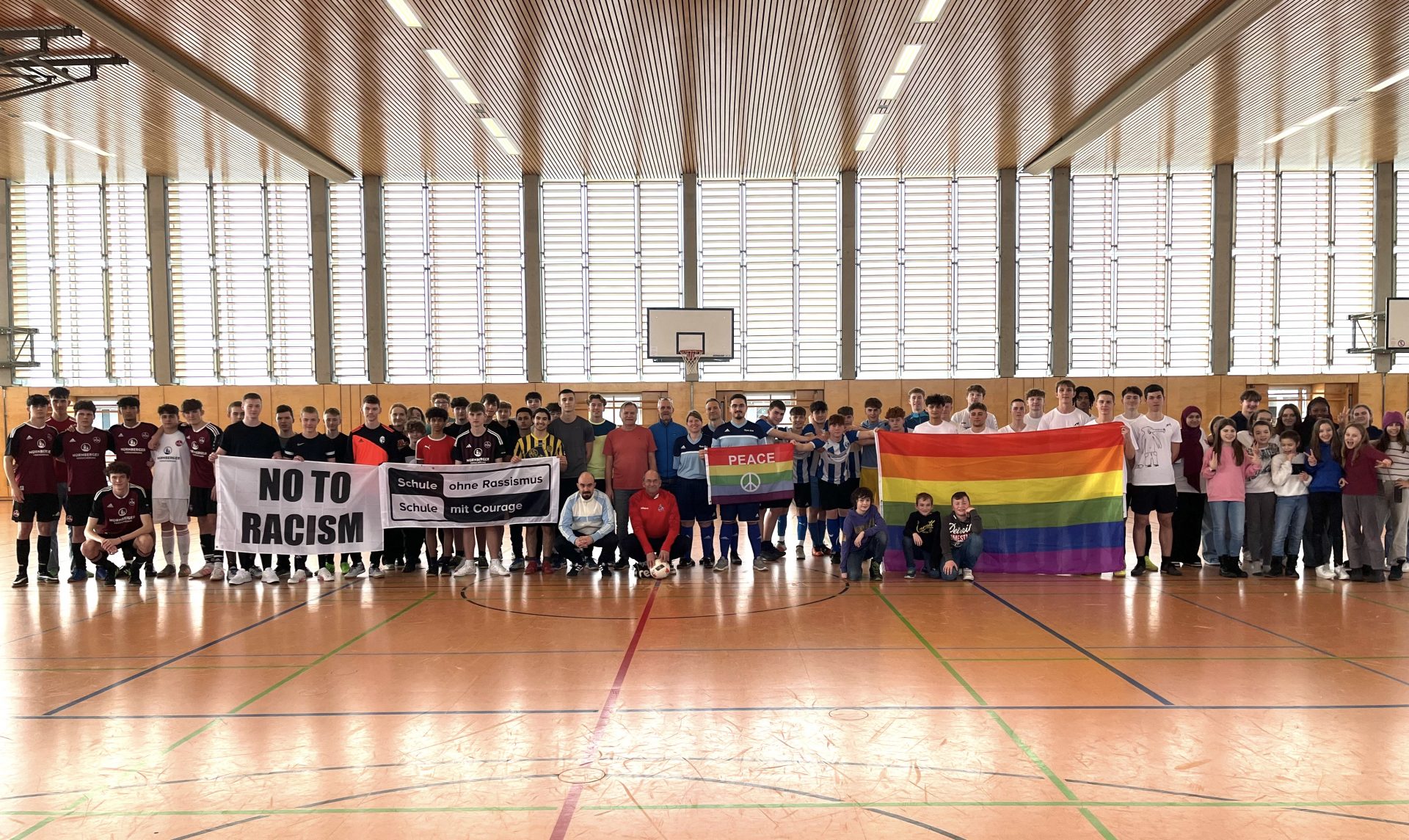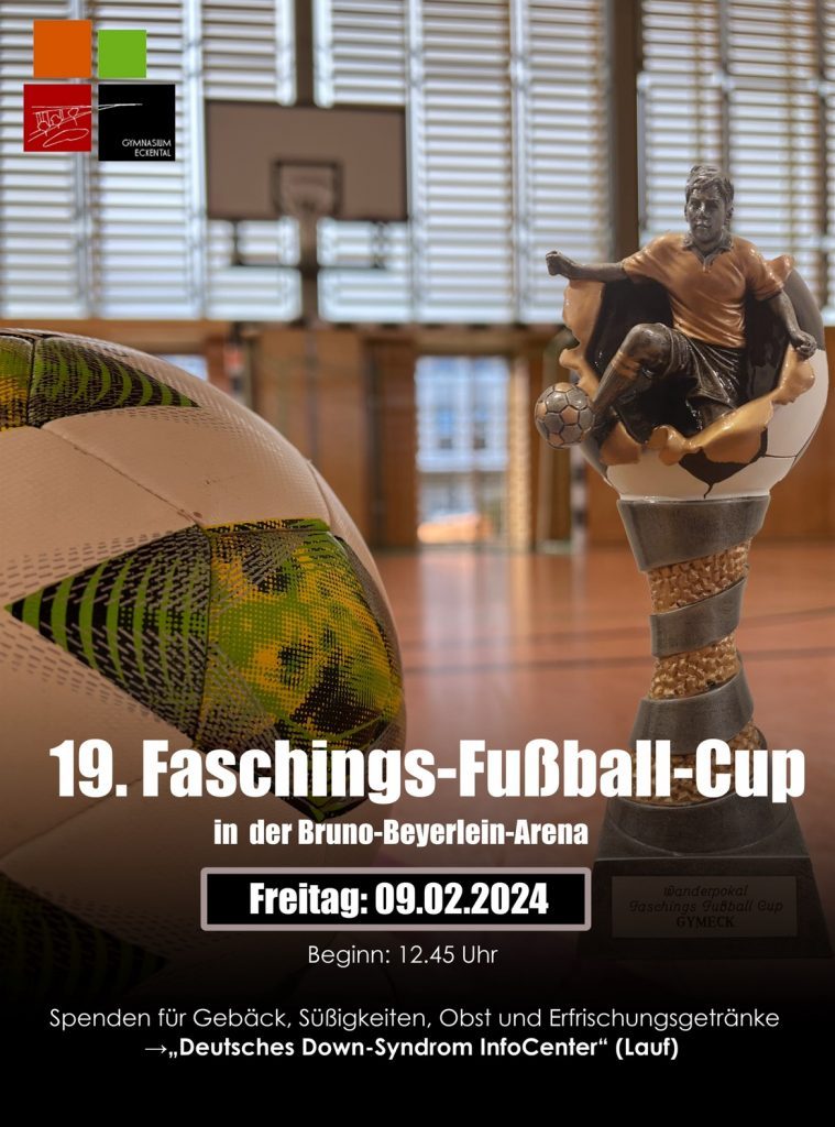 Am Freitag vor den Faschingsferien fand der 19. Faschings-Fußball-Cup am Gymnasium Eckental statt. Organisiert wurde das Turnier von der Klasse 11c, gemeinsam mit drei Lehrkräften. Im Vordergrund stand hierbei, beeinflusst von der aktuellen gesellschaftlich-politischen Situation, ein Zeichen gegen Rechtsextremismus zu setzen. Dies wurde in Form von Flaggen mit symbolischen Bedeutungen zum Ausdruck gebracht. Auch dieses Jahr war das Event wegen der starken Beteiligung ein großer Erfolg: Insgesamt traten sieben Schülerteams und die Lehrermannschaft „Muskelkater“ in der GymEck-Turnhalle nach Unterrichtsschluss an. Ab der ersten Minute war die Stimmung hervorragend und die Zuschauer feuerten die Mannschaften euphorisch an. Sowohl die Schülerteams als auch die Lehrermannschaft zeigten ihr Können durch großen Einsatz. Für die gute Stimmung sorgte neben der musikalischen Unterhaltung auch die Individualität der verschiedenen Trikots. Abgesehen von dem Wanderpokal für die Turniersieger, die „Bubatzbuben“, erhielten alle Mannschaften einen kleinen Preis. Zudem sorgte für die Stärkung der Mitspieler der Spendenstand. Dieser bot neben Sportgetränken ebenso Brezen, Krapfen, Bananen und Riegel. Wie jedes Jahr werden die gesammelten Spenden dem „Deutschen Down-Syndrom InfoCenter“ in Lauf übergeben, das durch die Beratung und Öffentlichkeitsarbeit Kindern, Jugendlichen und Erwachsenen mit Down-Syndrom hilft und sich für deren Recht auf gesellschaftliche Teilhabe einsetzt. Somit war der Fußball-Cup nicht nur ein ausgesprochen erfolgreiches Turnier, das die Schulgemeinschaft stärkte und Schülerinnen und Schüler sportlich motivierte, sondern er diente ebenfalls dem guten Zweck. Ein großer Dank geht an das Sani-Team, die Technikergruppe und die zahlreichen Fans, die dem Turnier die Faschingsstimmung verliehen.