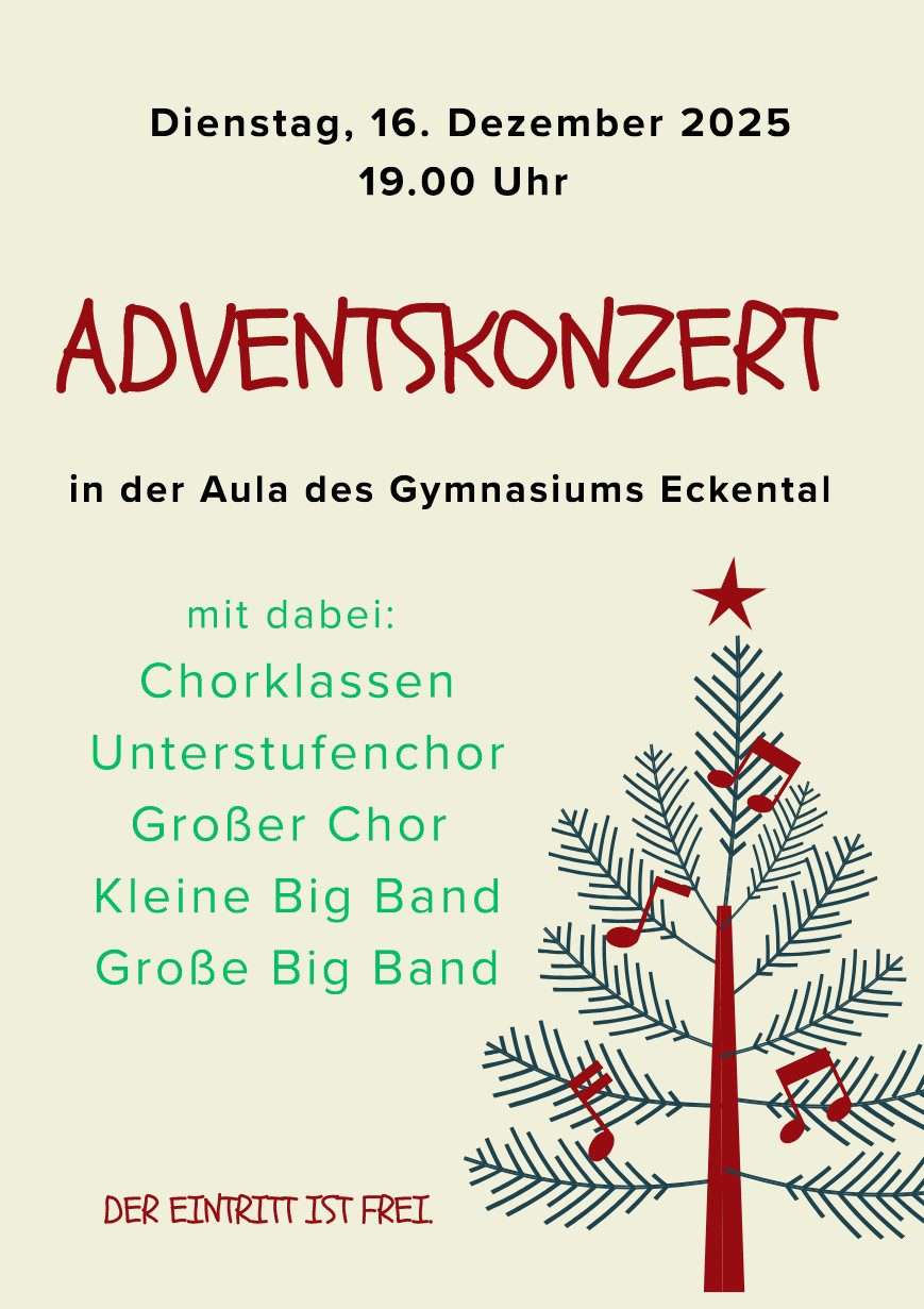Die Fachschaft Musik lädt alle Mitglieder der Schulfamilie herzlich zum Adventskonzert am Dienstag, den 16.12. um 19 Uhr in der Aula ein.