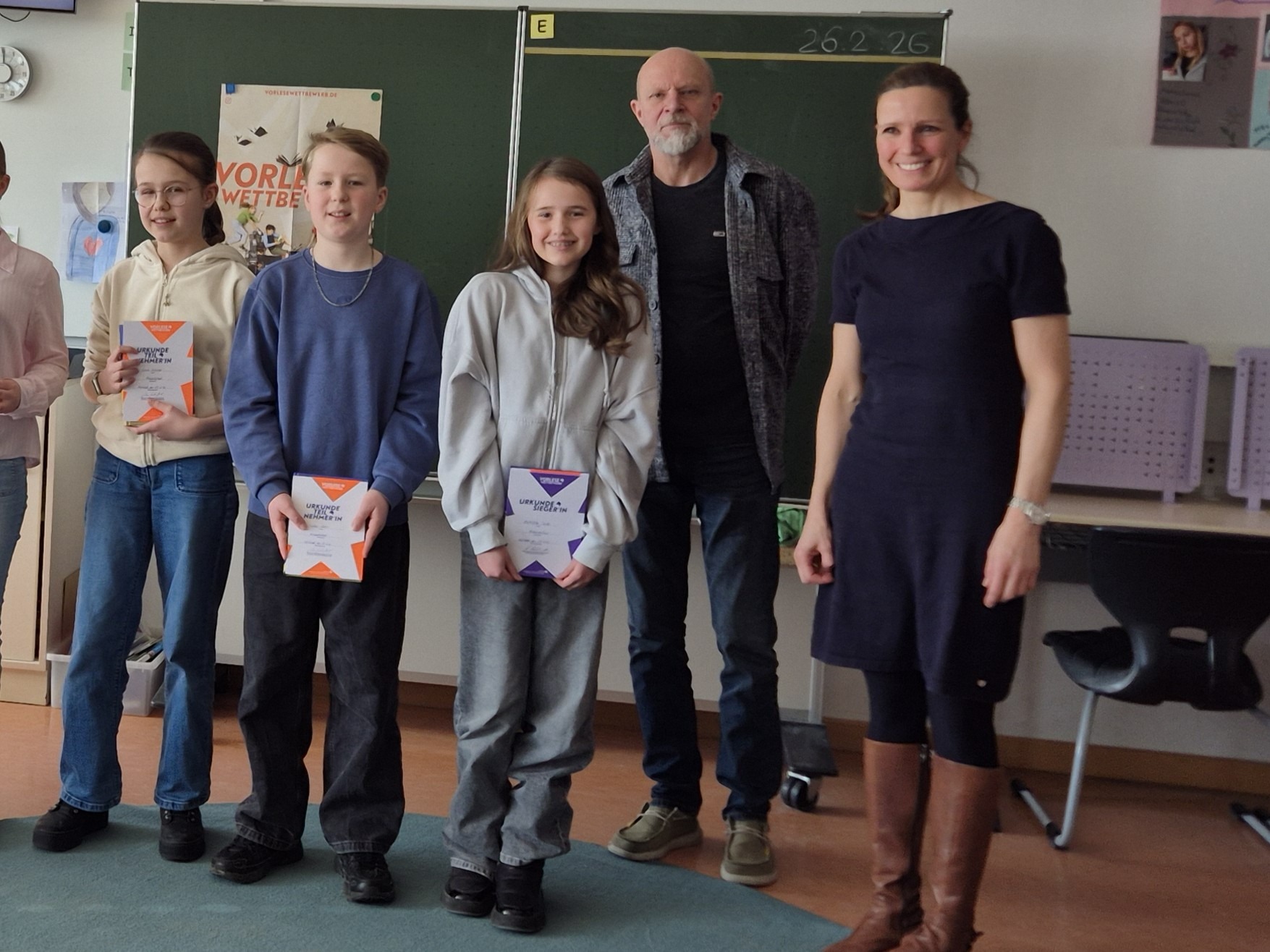 Wir gratulieren ganz herzlich Mathilda Tacke aus der 6d, die sich beim Kreisentscheid des bundesweiten Vorlesewettbewerbs in Höchstadt am 27.02.2026 gegen 7 starke Vorleserinnen und Vorleser durchsetzen konnte. Wir wünsche ihr viel Erfolg beim Bezirksentscheid in Ansbach Ende März!
