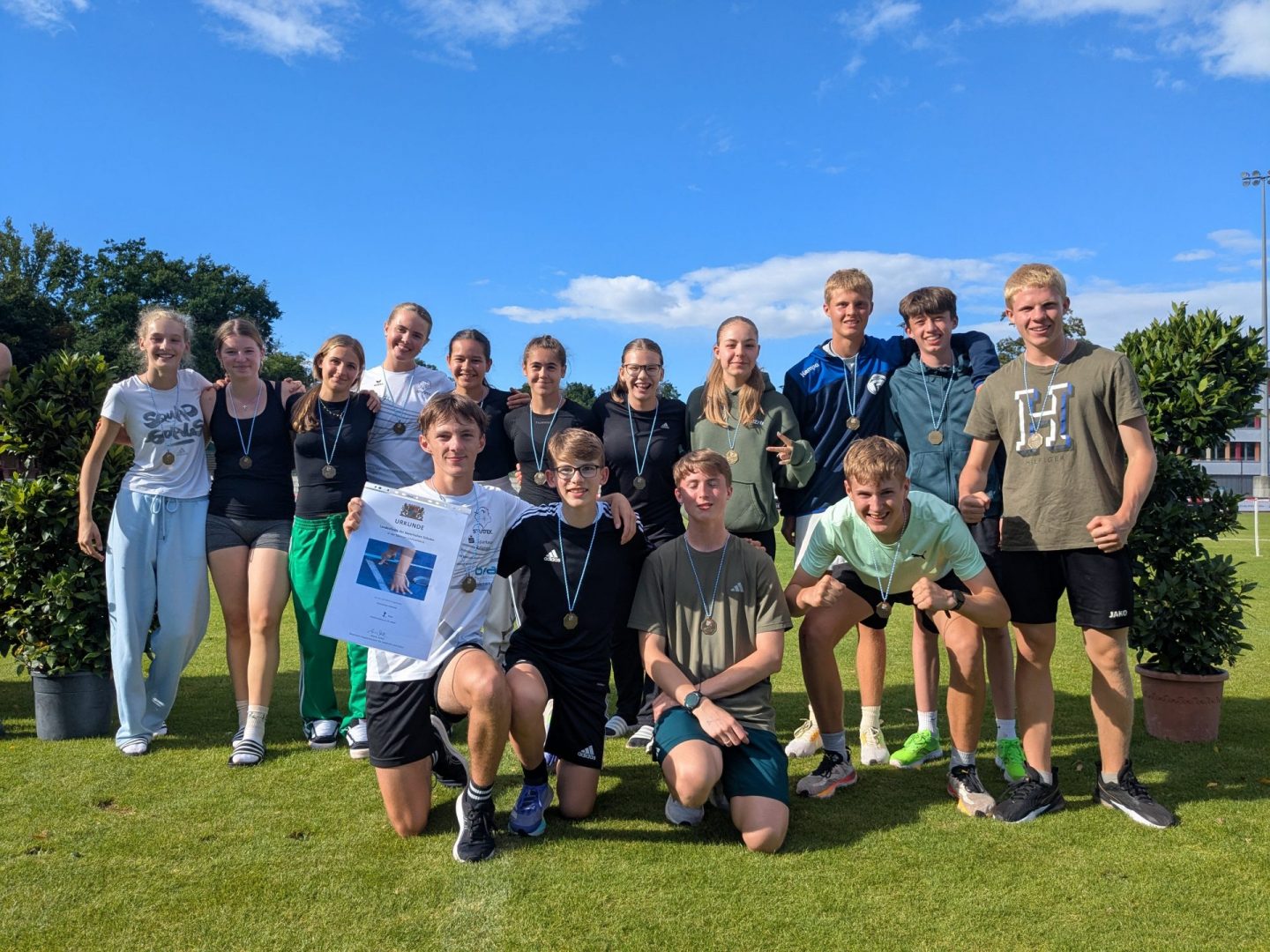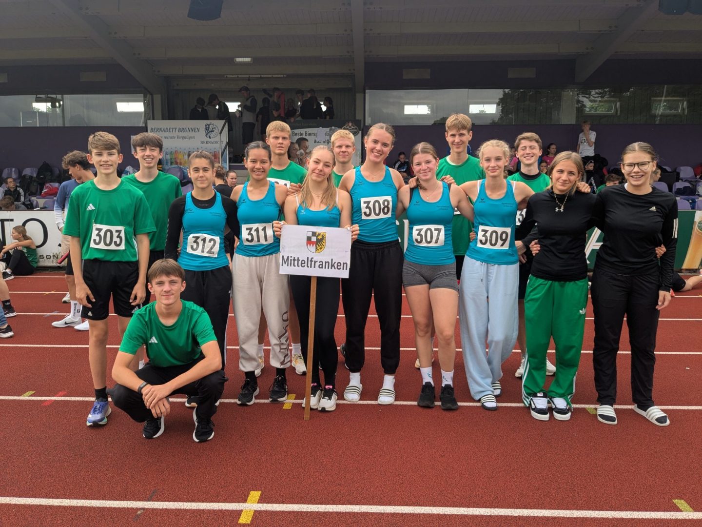 Fulminant endete das vergangene Schuljahr für die Leichtathletinnen und Leichtathleten mit einem dritten Platz beim Bayernfinale im Juli. Nachdem die Vorrunden immer hauchdünn gewonnen wurden, war es auch die letzte Disziplin, die 800 Meter, die das Team im Bayernfinale von Platz Fünf noch auf den Bronzerang hievte. Nervenkitzel war in der gesamten Saison garantiert. Eine starke Leistung der 18 Athleten und Athletinnen.