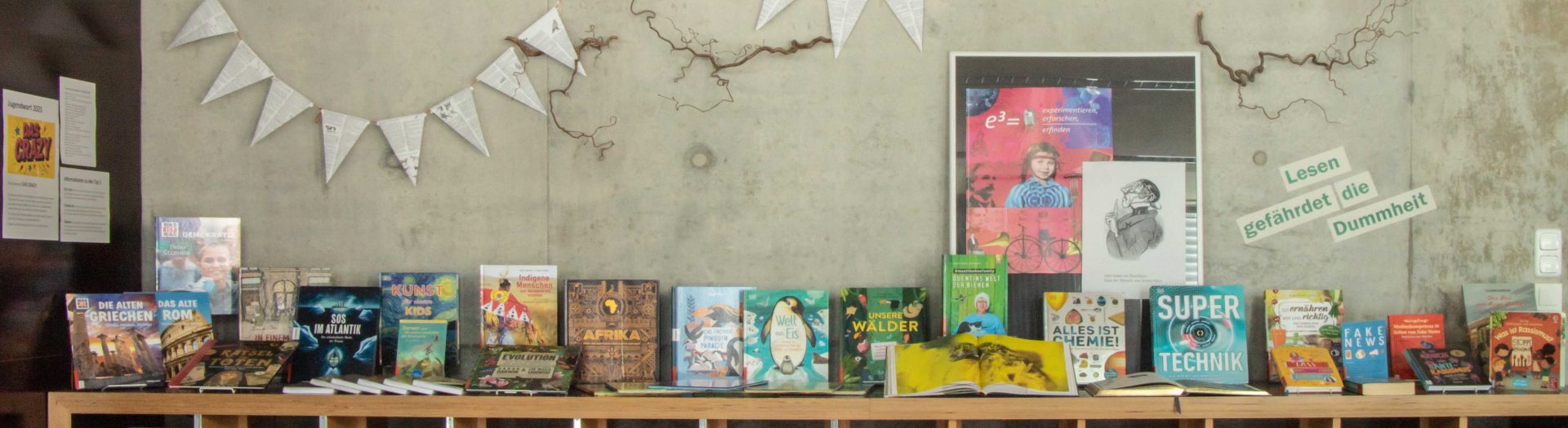 Wechselnde Buchausstellungen informieren z. B. über Schulthemen, historische Jahrestage und über aktuelle Ereignisse aus Politik und Kultur (siehe Bild unten).