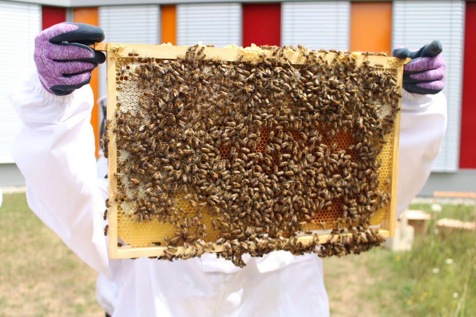 Zum Ende des Schuljahres kann der Honig geerntet werden. Dazu werden die Honigwaben dem Stock entnommen und in einer Schleuder ausgeschleudert (an dieser Stelle danken wir allen Sponsoren, die uns tatkräftig unterstützt haben). Der geschleuderte Honig wird dann mehrfach gesiebt und in Honigeimer abgefüllt. Nach einer Ruhezeit, in der der Honig mehrfach gerührt werden muss, kann er abschließend in Gläser abgefüllt und z.B. am Sommerfest verkauft werden.